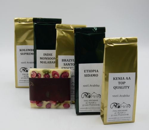 Herbatę i kawę pakujemy do foliowej torebki opatrzonej naklejką z nazwą i wagą. Torebki są zgrzewane z dołączonym specjalnym klipsem umożliwiającym częste otwieranie i zamykanie opakowania.
