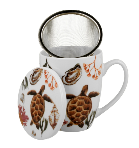 Kubek z zaparzaczem ŻÓŁW wchodzący w skład serii Seaside, wykonany z porcelany New Bone China, która charakteryzuje się naturalnym kremowo-białym kolorem z delikatnym połyskiem oraz wyjątkową wytrzymałością i trwałością, zachowując lekkość i finezję.