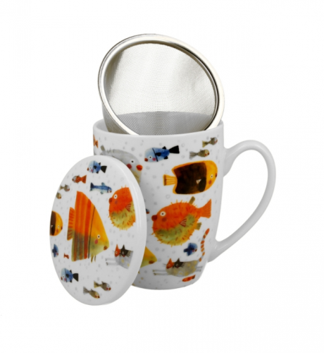 Kubek z zaparzaczem RYBY wchodzący w skład serii Seaside, wykonany z porcelany New Bone China, która charakteryzuje się naturalnym kremowo-białym kolorem z delikatnym połyskiem oraz wyjątkową wytrzymałością i trwałością, zachowując lekkość i finezję.