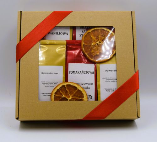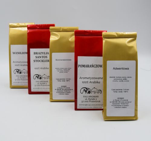 Herbatę i kawę pakujemy do foliowej torebki opatrzonej naklejką z nazwą i wagą. Torebki są zgrzewane z dołączonym specjalnym klipsem umożliwiającym częste otwieranie i zamykanie opakowania.