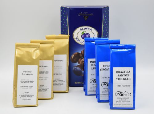 Herbatę i kawę pakujemy do foliowej torebki opatrzonej naklejką z nazwą i wagą. Torebki są zgrzewane z dołączonym specjalnym klipsem umożliwiającym częste otwieranie i zamykanie opakowania.