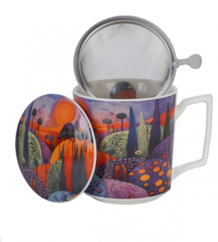 Linia zdobiona nowoczesnym i artystycznym wzorem malowniczego pejzażu falujących wzgórz, pełnych życia i ekspresji. Intensywna paleta kolorów - od głębokich fioletów i różów w tle, przez intensywne pomarańcze i żółcie, aż po soczystą zieleń i spokojny błękit w pierwszym planie, tworzy harmonijną kompozycję. Wzór łączy w sobie tradycyjne rzemiosło z nowoczesnym designem o niezwykle świeżym charakterze.