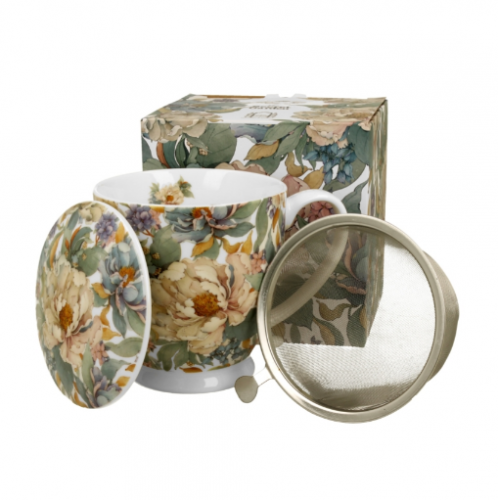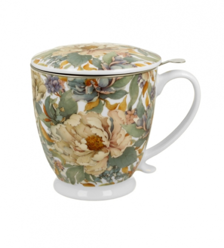 Kubek z zaparzaczem na stopce PEONY WHITE wchodzący w skład serii Kwiaty Royal, wykonany z porcelany New Bone China, charakteryzującej się elegancką i naturalną kremowo - białą barwą z delikatnym połyskiem, a także wyjątkową wytrzymałością.